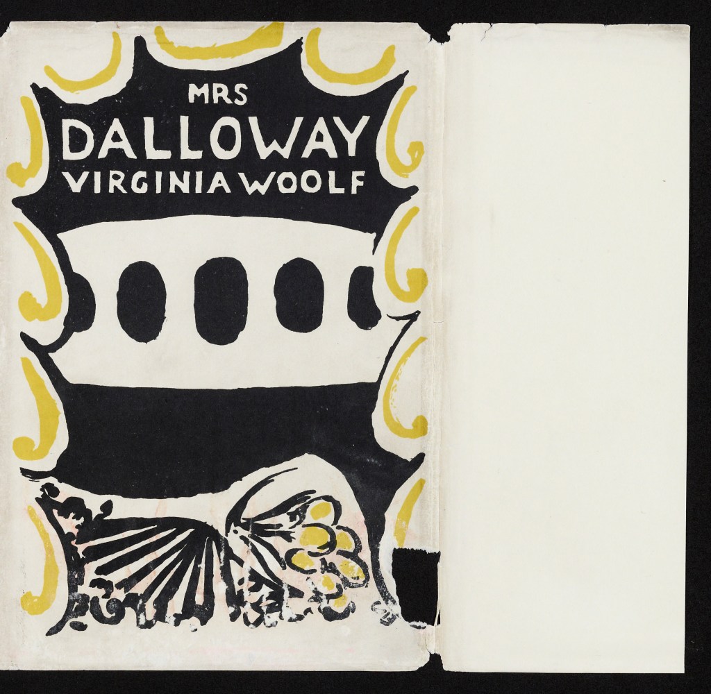 Vanessa Bell, Virginia Woolf’s artist sister, painted many of Woolf’s book covers, including Mrs. Dalloway. The simple but not simplistic cover uses a white background and, of course, only black and yellow otherwise to entice a would-be reader. Works beautifully for me.