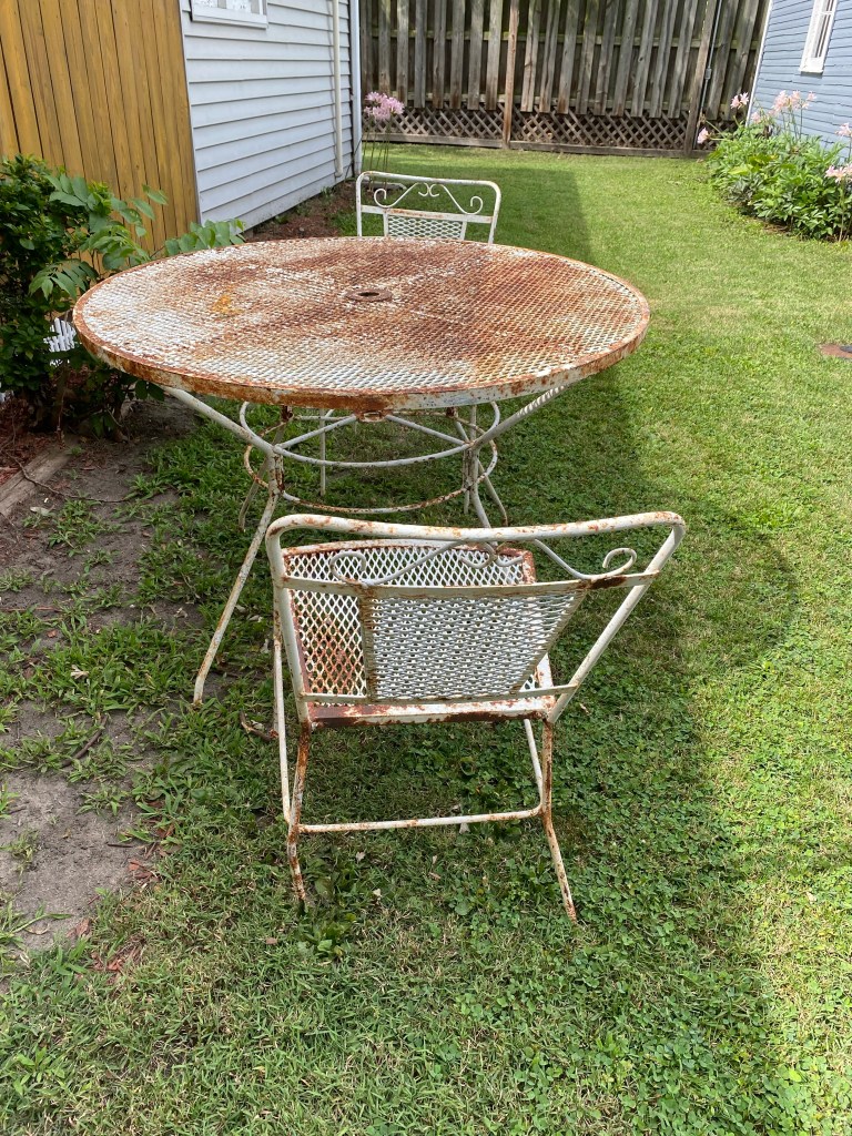 We aren’t finished yet but are trying to complete our outdoor projects in the next few weeks before colder weather sets in. I’m repainting a cool metal outdoors patio set I found at a local antique store so I can create my own outdoors writing area. Take that, cafes that close and break my heart!