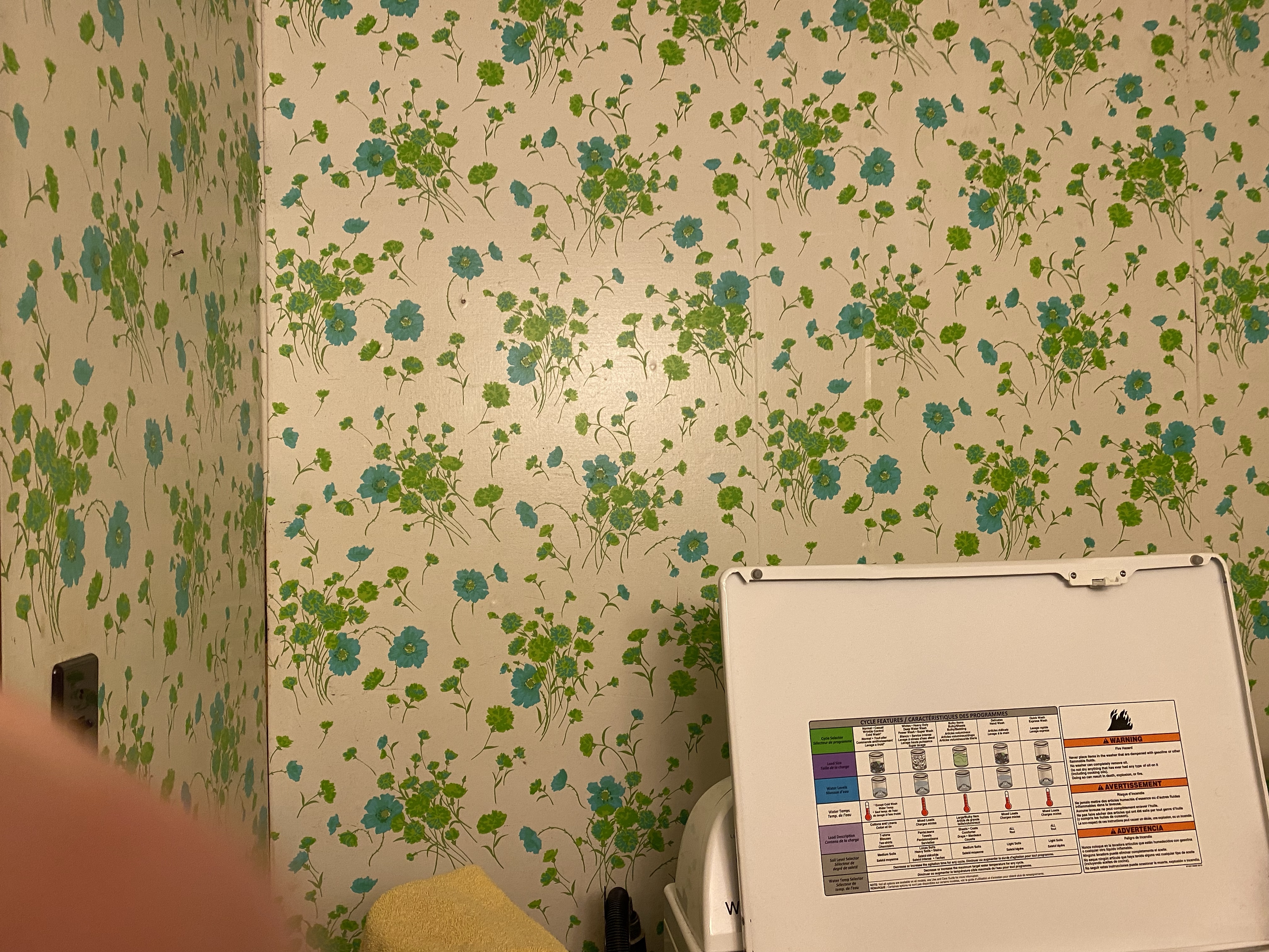 I can’t believe I’m going to show you the wallpaper I stripped, but I have to. It’s so, so ugly! Are you ready for this? (I didn’t put the wallpaper up to begin with, I must say!)