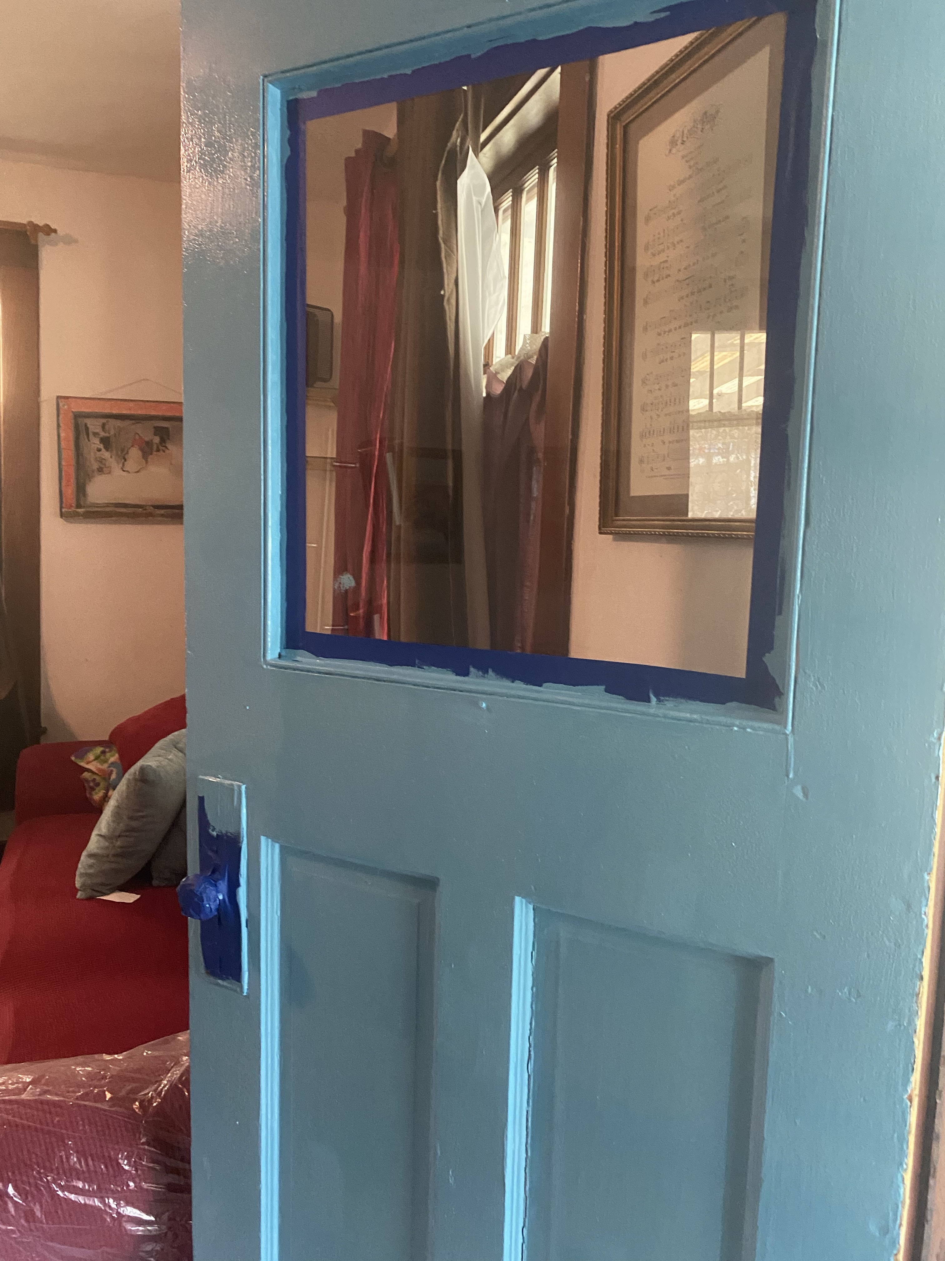 And speaking of magic, let’s talk about doors. Decked out in shades of Grecian blue, these doors unified our street, as most of our neighbors also sport blue doors. (I did not start the trend, only saw it and raised it from a whisper to a yell. LOL.) The photo below is the door in progress, before I finished it. The dark blue is painter’s tape.)