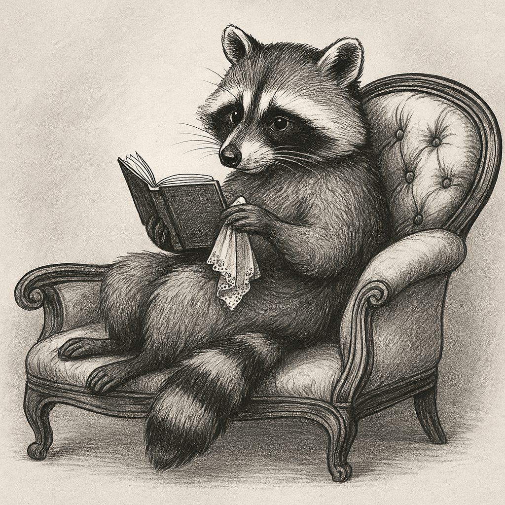 I tried setting the vibe for this with John Green’s musical tastes, but I have a feeling I’m gonna have to find Drema Sass music and be happy. The word raccoon has dressed me today (my hubby’s castoff porkpie hat, a purple tee with some sort of an animal print at the bottom though I don’t DO animal print– there’s an explanation, but not now) anyhow, I don’t trust her to give me writing fluid, too.