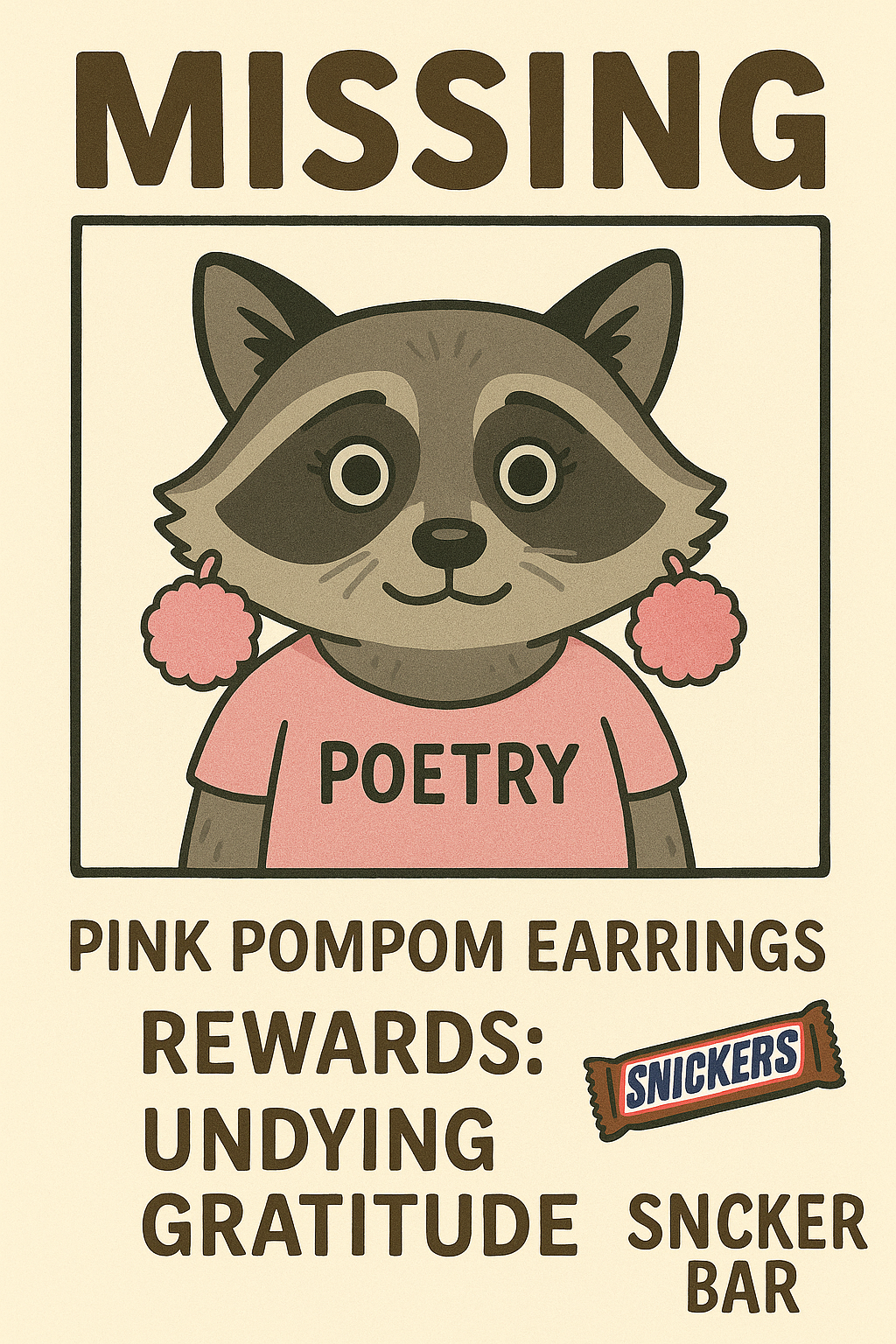 Because of this tragic earring displacement (Ha! No vector quantity intended—though honestly, Word Raccoon is pure displacement), she has refused to write any poems today.