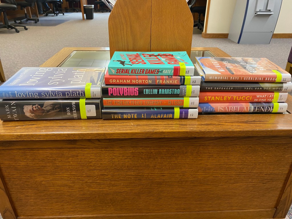Library books go stale if you wait too long to read them. I read and drop ’em in the return box as soon as I’ve finished one. Today’s haul! I felt giddy over my choices — I had to sit down and relish my precious ones.