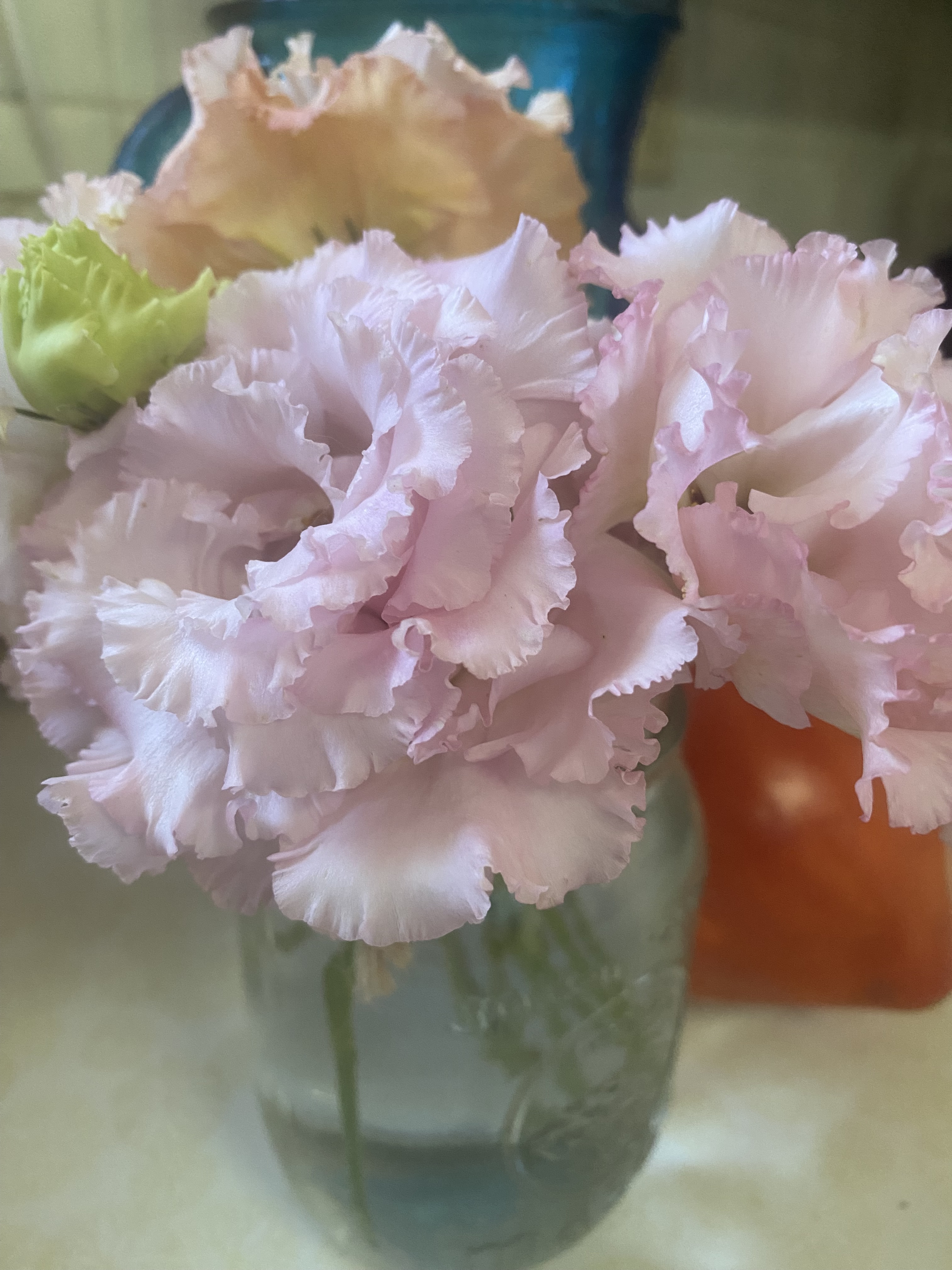 I bought flowers from the farmers market to celebrate: Lisianthus. Could not say no to a bonnet-wearing teen selling frilly pastel blooms almost as pink as her dress. The flowers are coming to the coffeeshop this afternoon while I wrestle this poetry collection into an arc.