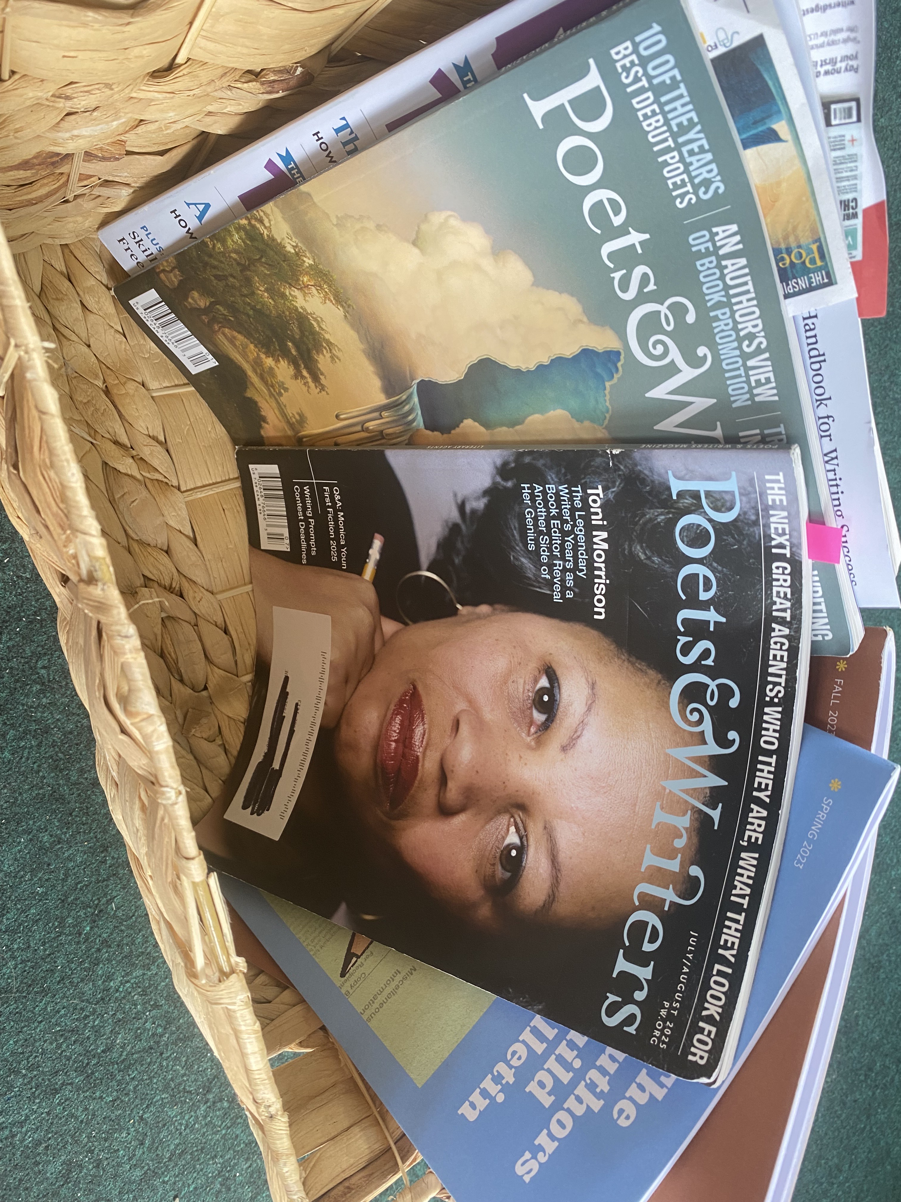 I found a copy of a Poets & Writers with the paid ad for my second novel, Southern-Fried Woolf lurking in the basket. It’s still exciting to see it there. (A reader wrote me a sweet message about that novel just today.)