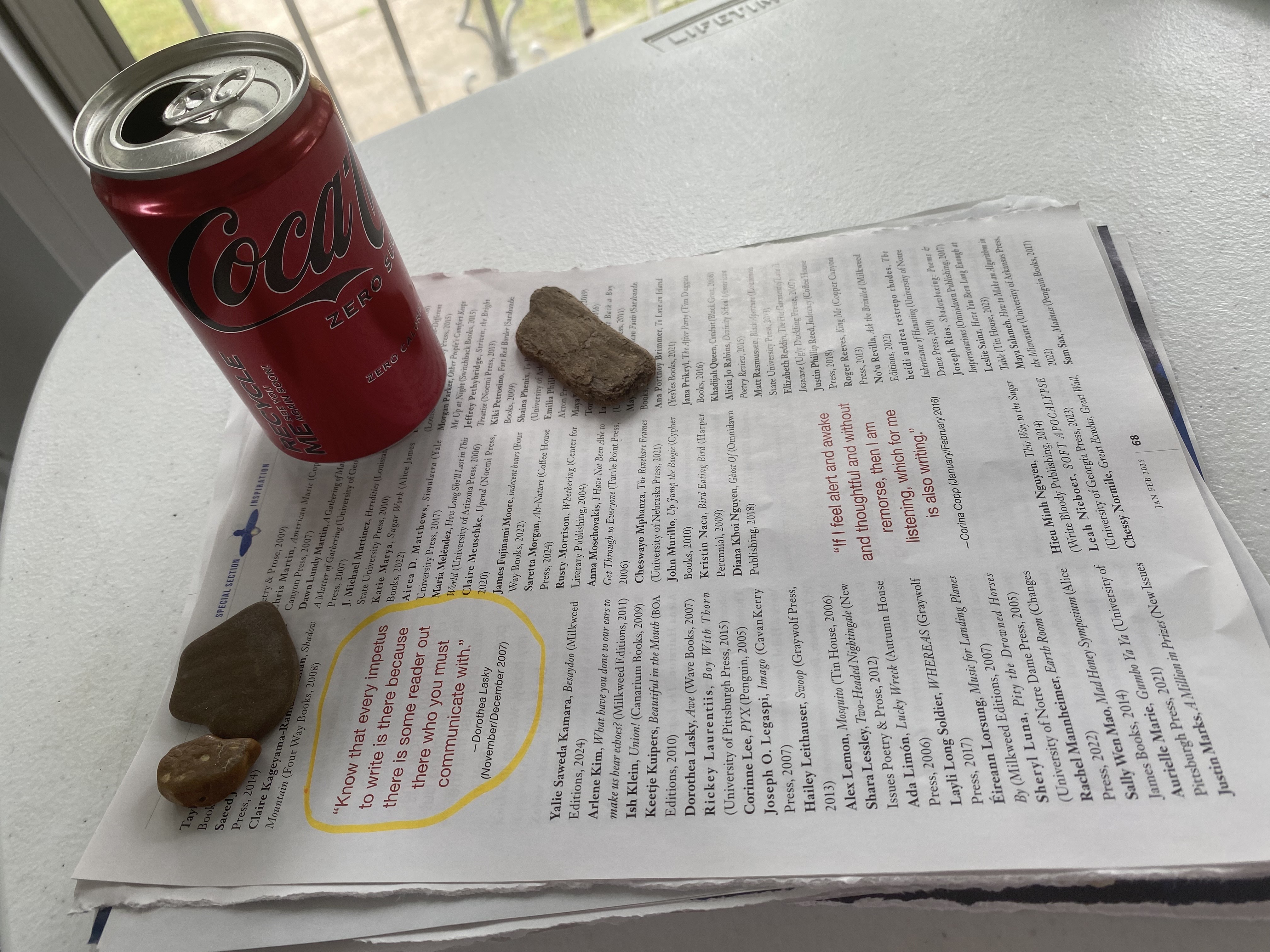 She squeaked at me until I tore out the Hirshfield article as well as all the writing prompts. Since when, WR? We HATE being told what to write, but I listened to her, and then she tried to drag the entire basket under the couch like it was a shiny treasure hoard.