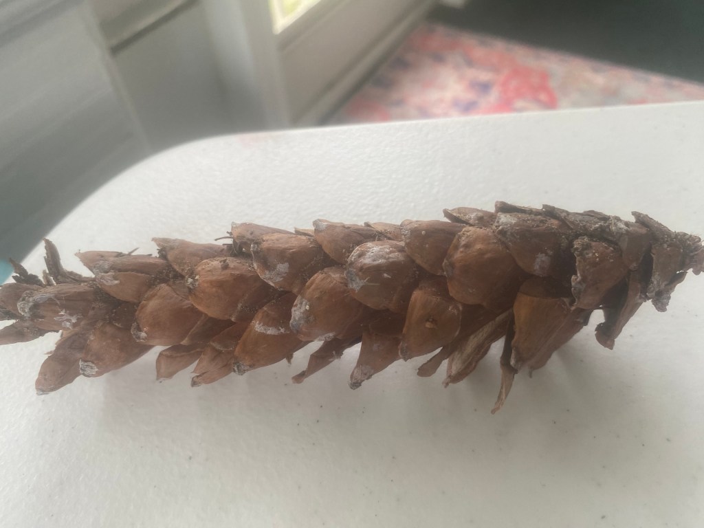 The pine cone is sitting with me on the porch, and I’m trying not to go back for the rest.