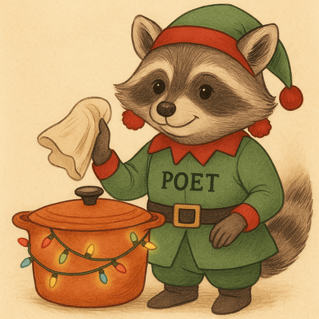 It’s beginning to look a lot like Christmas over here, by which I mean absolutely everything in this house has relocated itself, and Word Raccoon has commentary on every last twinkling light. The more color the better, she insists. If she could wrap the Dutch oven in garland, she absolutely would.
