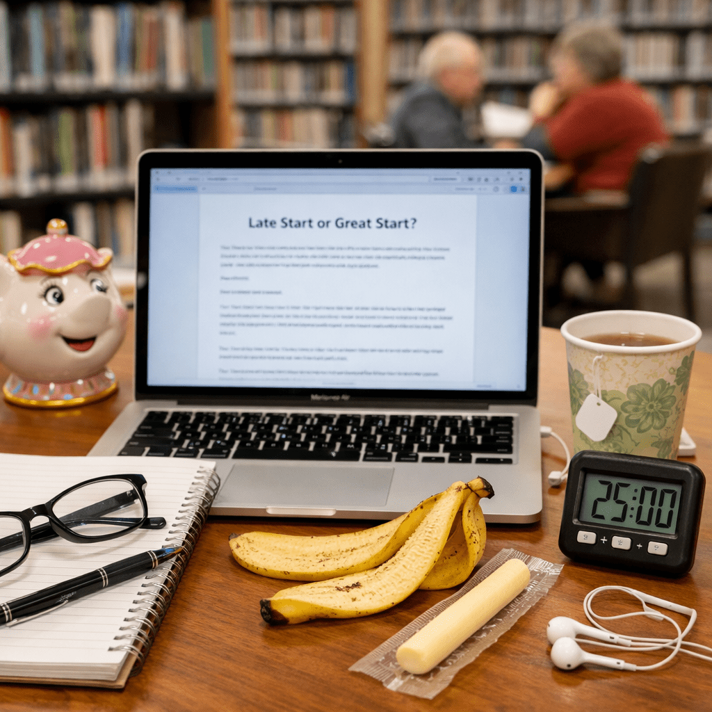 So now I’m at the library. It’s already ten. I’m an hour later to the page than I’d hoped and here’s a question: what’s the etiquette on a banana peel in a public space? Like… do I need to wrap it and bring it home or is it okay to just drop it in the library trash?