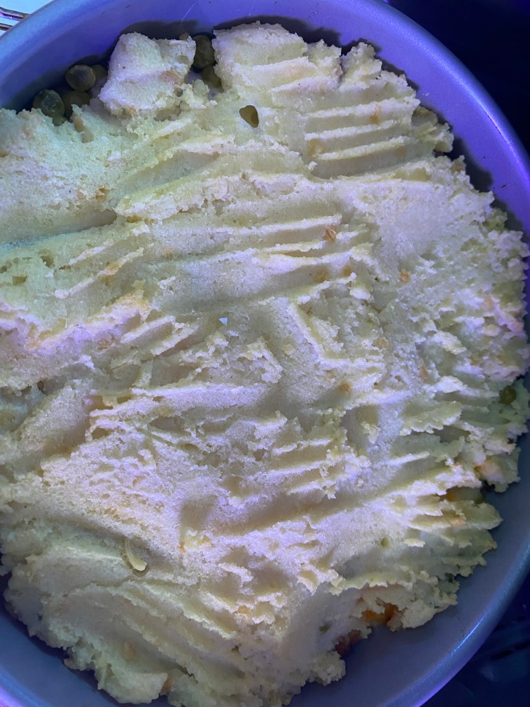WR told me not to do it, but I didn’t listen to her. I made a version of Shepherd’s Pie (which, when you use ground beef, is technically Cottage Pie, I guess?) using, yes, meatloaf, with everything else Shepherd’s Pie mixed in and topped with…latke pancake mix.