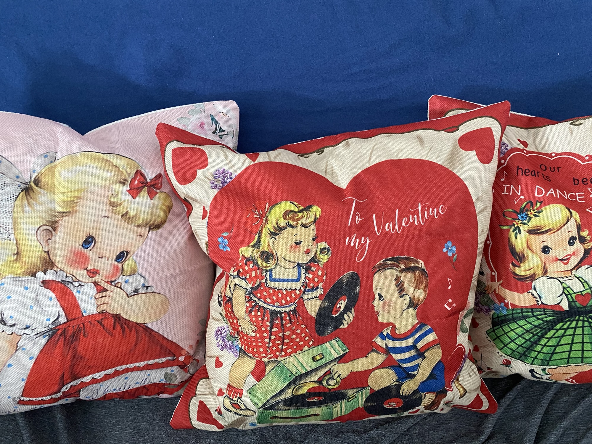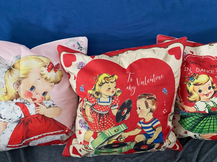 The stairs are now strung with felt hearts. The sofa is filled with pillows with vintage Valentine’s Day card prints on them. Barry hung the lights in the dining room archway.