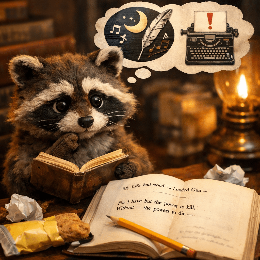 So when Dickinson compresses meaning and leaves it partially veiled, I want her to say it plainly. I want the sentence to behave like a sentence and not a riddle. Word Raccoon would like to file a formal complaint with the Department of Declarative Statements against some poets.