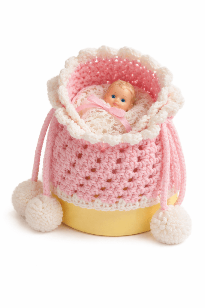 It mentions a purse I had as a child that I can’t seem to find any similar photos of online, so I had an image created for me. Maybe you remember these crocheted purses made from butter tubs?
