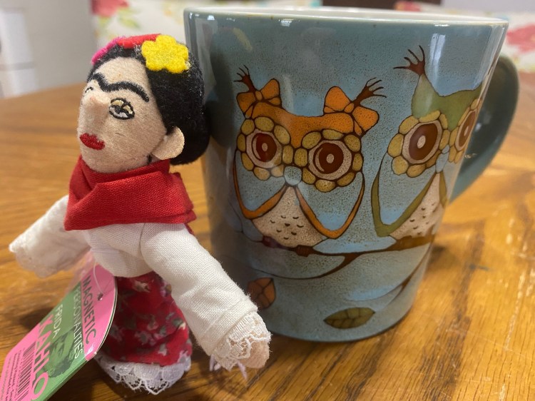 Also, not to pivot wildly, but look at this owl mug I got in yesterday to review. I am not reviewing it here. I am simply saying it is both adorable and enormous, and that Frida finger puppet has bravely agreed to serve as a scale model. Makes me look forward to tea time.