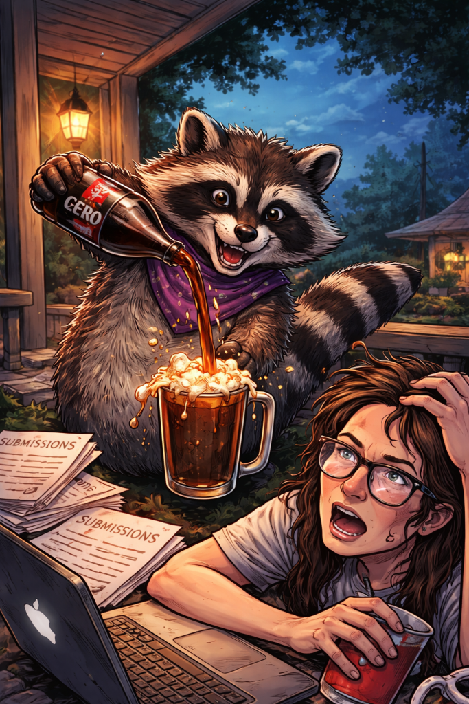 Word Raccoon keeps pouring Coke Zero and iced tea into me, begging me to submit to just a few more journals tonight.