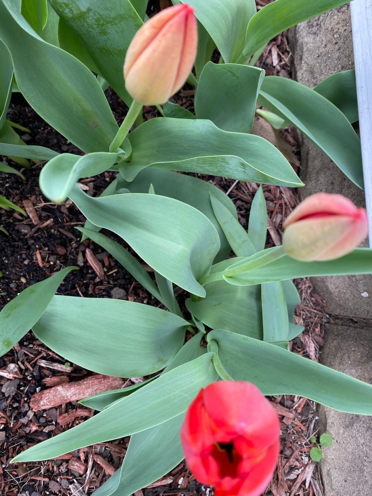 The tulips are fully bloomed now. Such pretty red flowers swaying in the wind, glistening with raindrops. We have some yellow ones indoors, and I’m planning to save the bulbs to plant in the fall.