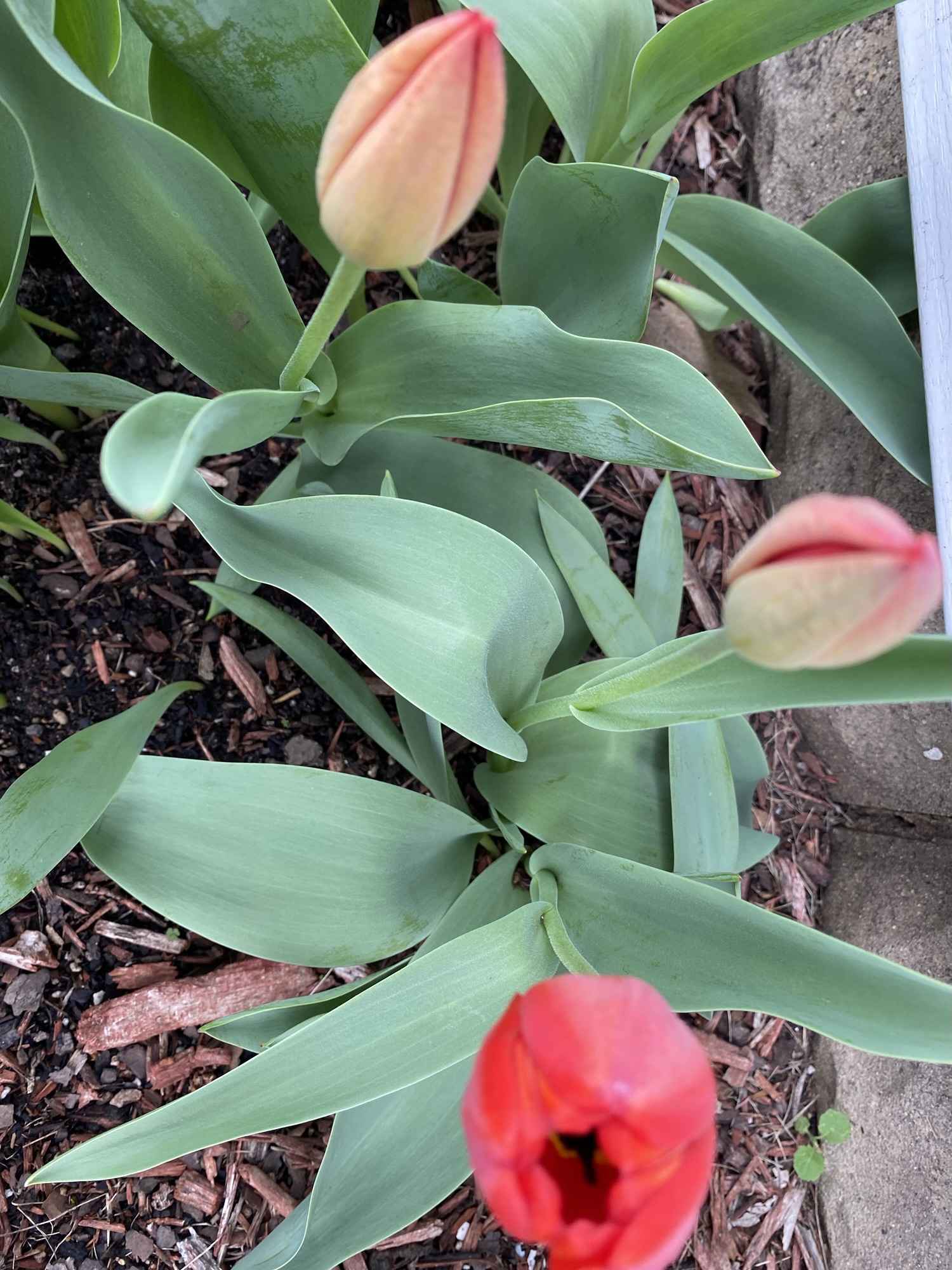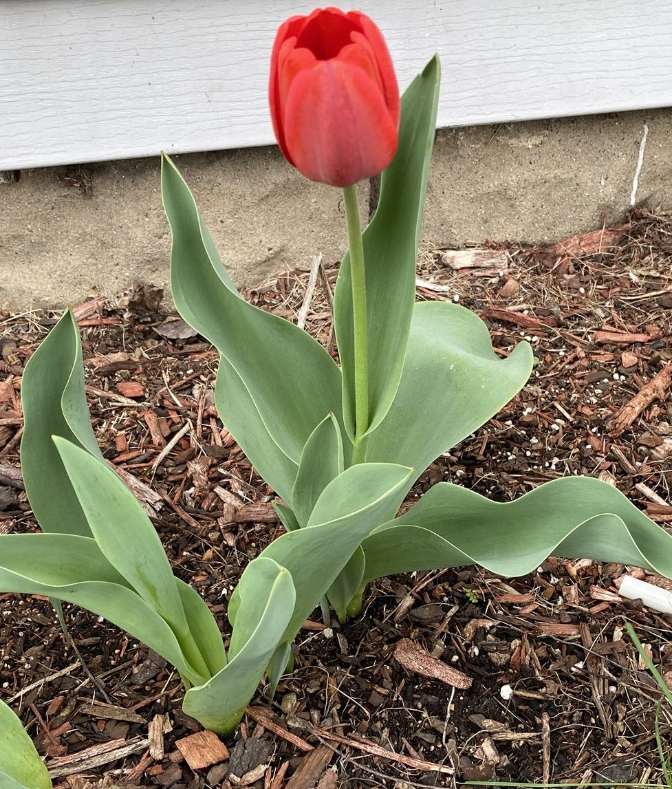 The tulips are fully bloomed now. Such pretty red flowers swaying in the wind, glistening with raindrops. We have some yellow ones indoors, and I’m planning to save the bulbs to plant in the fall.