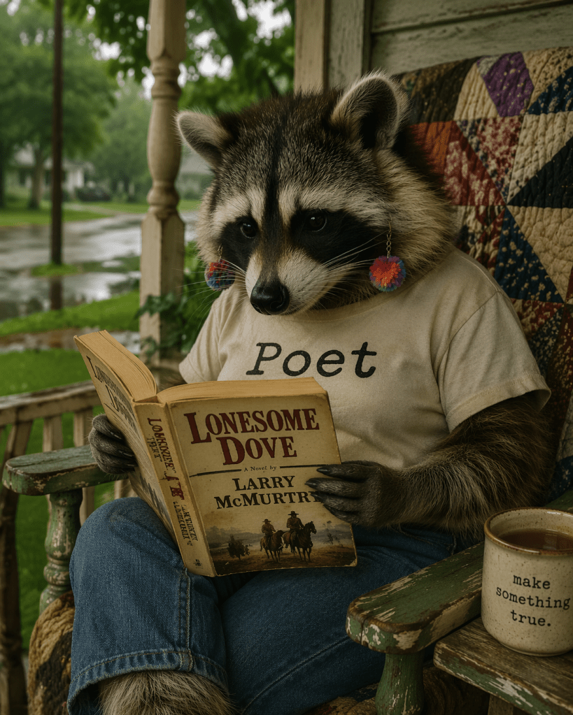 This morning, I came to the porch with two books because my eyes have mutinied against most screens. It’s not that they can’t watch anymore, it’s that they don’t want to. “Give me words to read. On paper,” said Word Raccoon, holding out her hand.
